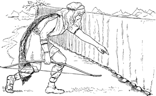 Men ”Goa” eller den Goda, var en gång Skade, eller vintern, Öndurdis eller Skiddisen, den skidåkande gudinnan från Nordanlanden, Tjatses dotter. Henne har jag skrivit om tidigare vintrar, och man behöver inte ta till noa-namnet eller den eufemism man satte in istället för Skades ursprungliga namn, det som fått ge namn åt hela Skandinavien. Såhär emot vinterns slut, då hela Mälardalen drabbats av tö och blidväder, och det på andra platser i vårt land råder svåra översvämningar, saknar nog många av oss den korta vinter som varit. Den ursprungliga Skade skildras ofta som skidåkande, och vid 1900-talets början hade konstnärerna följande bild av henne, som föga skiljer sig från Olaus Magnus, 400 år tidigare.