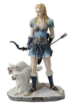 Här har vi en mer än ovanligt kitschig porslinspjäs, ett slags blandning mellan Marvel Comics fiktiva Valkyria Brynhilde och den riktiga, jagande Skade – och de flesta amerikaner har inte kommit längre än såhär, när det gäller att skildra hur den verkliga Skade faktiskt kan se ut. De Navkapsel-liknande sakerna hon har över brösten gör inte saken bättre, och inte heller Vargarna, som visst inte är Skades vänner i mytologin, utan snarare hennes fiender. Vargen var allmänt hatad – med rätta – i det gamla Norden och något man avskydde och jagade så fort man kom åt, inte något man omhuldade och gullade med. Gudinnans klädsel stämmer inte alls med verkliga vinterförhållanden, för man kan inte tänka sig henne först med pälsstövlar och sedan barbent, och helt utan köldskydd för hals, barm och överarmar, om hon nu ska röra sig i vinterklimat.. Visserligen kan gudar och gudinnor anta vilka former och utseenden de vill, och visserligen har de övermänsklig uthållighet emot exempelvis kyla eller hetta, men de är inte dumma, utan uppträder naturligt och praktiskt, det kan vi utgå ifrån om vi verkligen läst Eddans berättelser, och är dem trogna, vilket är den viktigaste utgångspunkten för all tro… Vad jag vill komma bort ifrån, är all Amerikansk ”cosplay” och andra bilder av Skade, som kan se ut på det här viset: