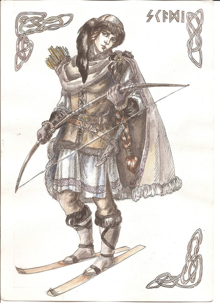 Hennes äktenskap med Njord, havets gud, blev för många blott en parantes, och det är som jaktens och skidåkningens gudinna i Ydalarna, eller Idegransdalarna, de flesta skildrat henne. I mer lyckade framställningar gjorda av dagens asatrogna ser hon ut såhär, fortfarande på skdior och bastant påpälsad i vad som ska ge ekon av järnålderns kvinnliga vinterdräkt.