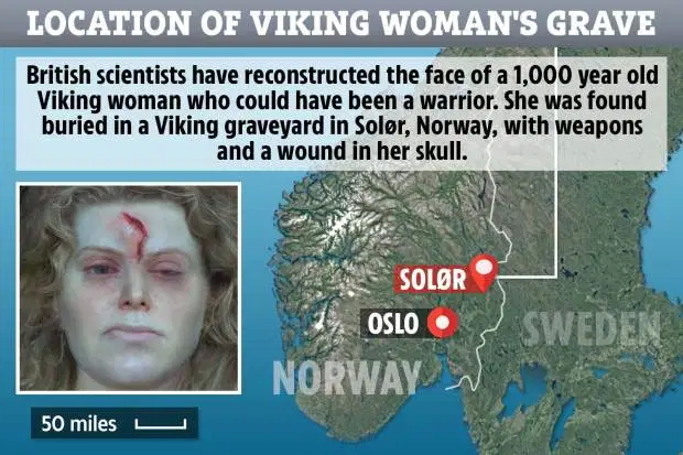För tre dagar sedan började internationell press, bland annat kvällstidningar i England, påstå att man i Norge hittat definitiva bevis för en kvinnlig krigares grav från Vikingatiden. Både Daily Mail och The Sun har publicerat artiklar om detta ämne. Fyndet, från Solör utanför Oslo, förvaras nu på Oslos Kulturhistoriska Museum, men har varit känt en längre tid. Det nya är att man nu gjort en ansiktsrekonstruktion med forensiska metoder, som uppges vara mycket exakt, och på den syns en stor rispa i pannan, som osteologer ansett ”konsistent med ett svärdshugg”, även om det hugget säkerligen inte var dödligt, i alla fall inte om kvinnan ifråga – troligtvis i trettioårsåldern – inte föll offer för stelkramp eller blodförgiftning, vilket förmodligen är osannolikt.