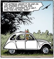 Hon har också Körkort – en det har inte Biskopen – som äger en gammal, mycket sliten Renault CV 2 – och Aktrisen tror hela tiden att hon är bra på mekanik och kan laga just den, ja hon kan allting som är praktiskt, laga mat, laga trasiga diskbänkar, hela rörmockeri-systemet och centralvärmen som inte finns i parets Brittiska hus också faktiskt – för så ÄR det – tror hon…