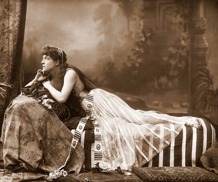 Här ovan ser vi henne i rollen som Cleopatra, något den viktorianska publiken i 1890-talets London på sin tid lär ha kommenterat med ”How very different, how very different indeed from the home life of our own dear old queen… (och inte ”queer old dean” vilket är en såkallad ”spoonerism” från Oxford)