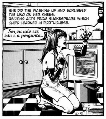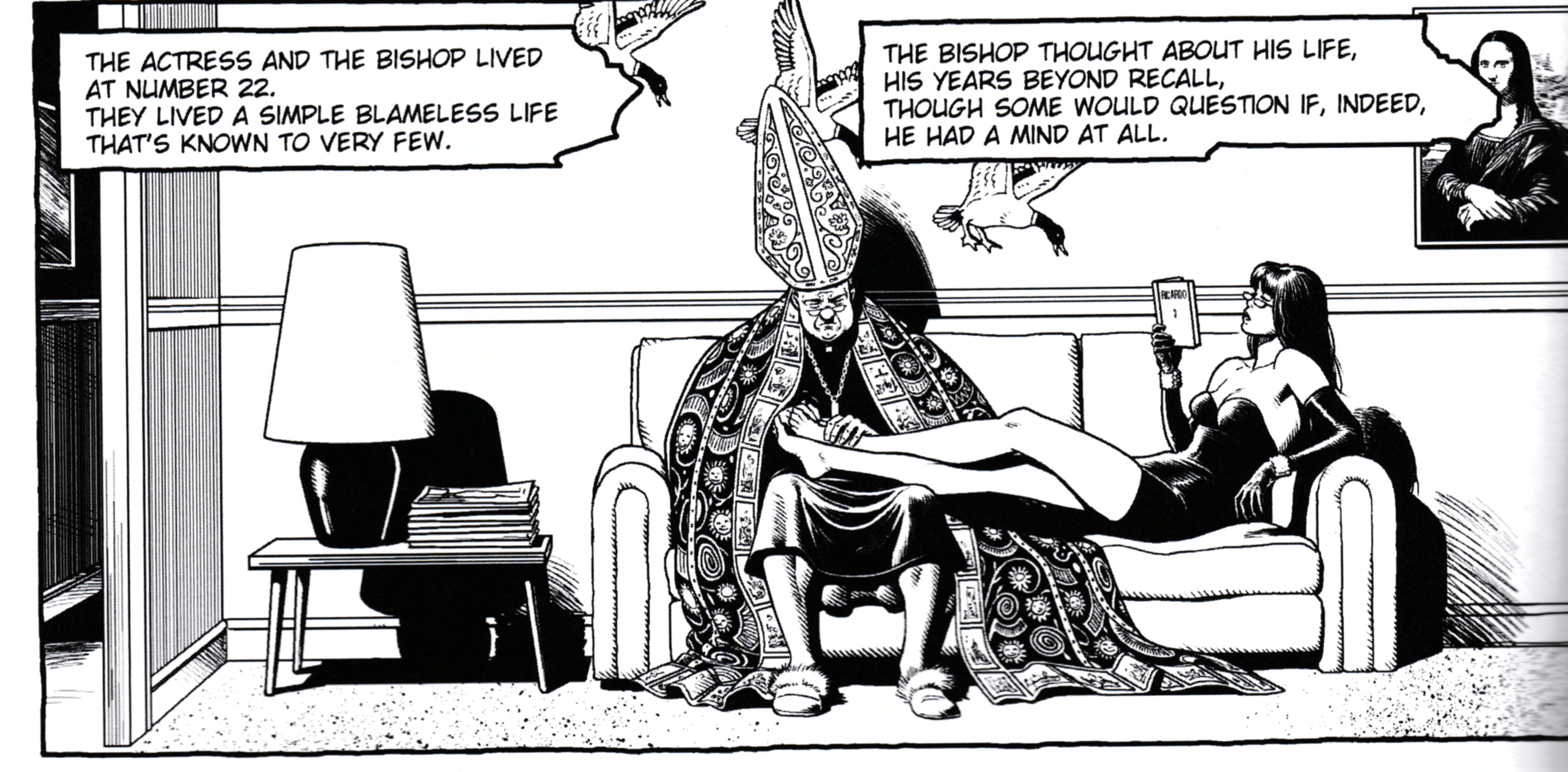 I det första avsnittet framstår ”Aktrisen” som ungefär 40 år, något gnatig,åldrad i förtid, en skugga av sitt forna jag och vad hon en gång k-a-n eller kunde ha varit, men i alla senare episoder är det helt annorlunda. Brian Bolland själv har flera gånger förklarat, att det sista han egentligen ville, vara att göra något pornografiskt av sina två rollfigurer, eller att vi ska uppfatta dem på just det viset. Deras förhållande som makar eller vad de nu är (vi vet fortfarande inte riktigt, som läsare) är helt uppenbart inte av det sexuella slaget. Han ville – har han sagt i intervjuer – göra Aktrisen – hans fru – till viljes, och därför skildrar han henne hela tiden som ett stycke yngre, och bra mycket vackrare än hon i själva verket borde vara – eftersom hon också uppfattar sig som sådan… Som Brittisk Gentleman och samtidigt Biskop är det egentligen hans skyldighet, förstår ni – samtidigt som hela serien försiggår på rim, inte på prosa, varje pratbubbla är egentligen en hel liten rimmad dikt, med ”inrim” i fyrdubbla rader och allt – helt enkelt därför att det passade honom att göra så.