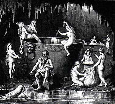 Ägir, den Nordiske Havsguden hette Mannan Mac Ller bland Kelterna på de Brittiska öarna, och Shakespeare skulle med tiden förvandla honom till Kung Lear, med endast tre döttrar istället för nio. Alla vet att Ägir är den väldigaste av bryggare, och att Tor for till jätten Hymer för att hämta den största bryggkittel som alls går att finna, det vill säga själva himlavalvet. Ägirs salar finns på havets botten, och där lär ölet aldrig tryta, vilket de som kommer dit nog skall bli varse i sinom tid. Man har sagt att Ägirs döttrar också är desamma som Heimdalls nio mödrar, eller den uppåtstigande solen som föds ur havet. Olika listor finns i Eddan vad beträffar vågdöttrarnas namn, men alla är ense om att de hjälper till vid själva bryggandet, och kanske också vid iskänkningen. Berömt är med rätta Ägirs gille, som skildras i Lokasenna, och där alla gudomar utom Sigyn, Lokes kuschade hustru var närvarande. Man har sagt att vågdöttrarna ännu hedras på Hebriderna den 3 Mars, och att skålar och horn fylldes av sig själva i Ägirs salar.