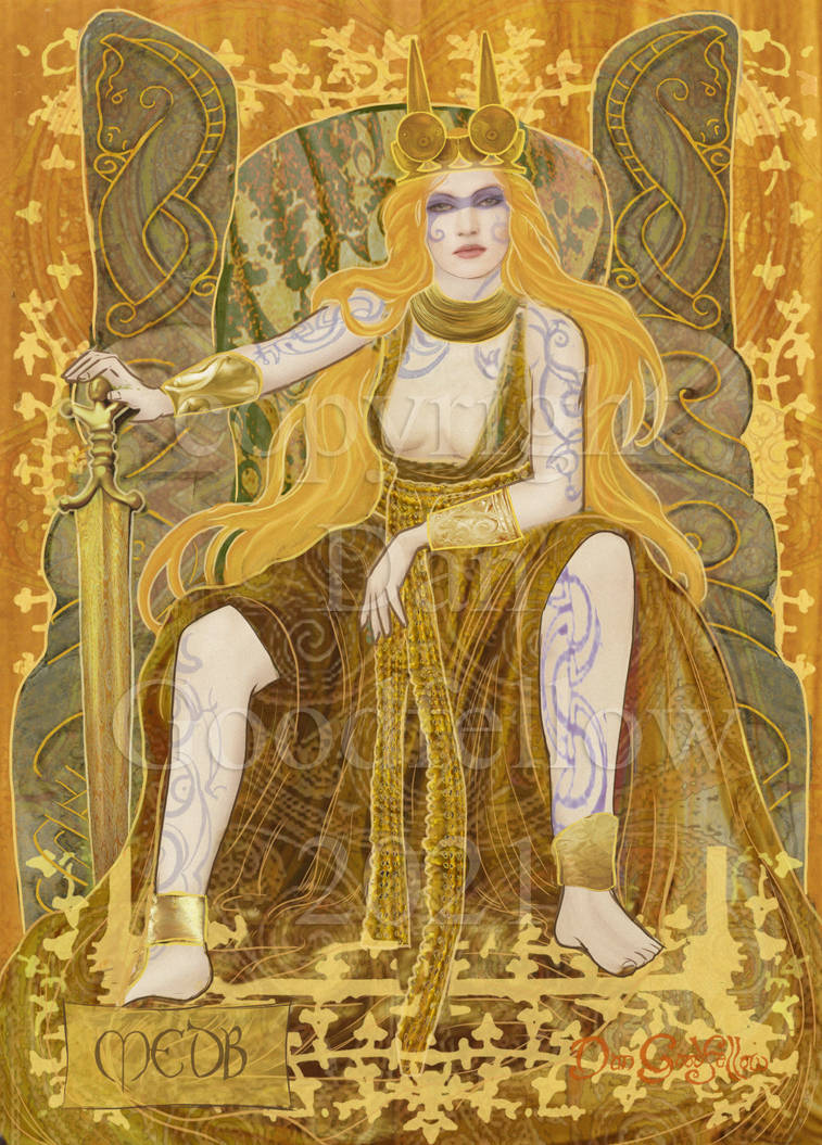 Meḋḃ, Meaḋḃ; Meadhbh, Méabh, Medbh eller Maebh har et tnamn som är närbesläktat med ”mjöd” och skall betyda ”hon som berusar” på Gaeliska. I senare myter omnämns hon som drottning över Connacht, men ursprungligen var hon en gudinna som räckte mjödbägaren till den som skulle bli kung. Även Shakespeares ”Queen Mab” eller Älvadrottningen kommer från samma källa. Hon beskrivs som blond och var nog från början samma gudomlighet som Gerd, jordgudinnan. E hel del platsnamn på Irland är också uppkallade efter henne, till exempel Ballypitmave, Baile Phite Méabh, ”Byn vid Medbs Fitta” i ordagrann översättning, liksom Boith Mhéabha, Medbs Bodar. Medb sades kunna löpa och springa fortare än en häst, och gav sina många älskare ett skönt rus, liksom det bärnstensfärgade ölet. Hennes festdag infaller vid Beltane eller Valborg, 30 April