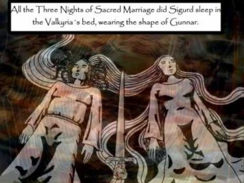 ”Maerum” är ett ord som i en annan grammattisk form förekommer även på Rökstenen, där det står ”Skati maeringa” alltså ”människors skatt”, mänsklighetens välgörare. De två människor Brynhild tänker på är väl i första hand henne själv och Sigurd, som ju sitter vid hennes sida på klippan; och läkehänder eller händer som kan uträtta något, är förstås gott att ha, de är lika solens skinande strålar, som lyser upp i tillvaron. Man och kvinna ska göra detta tillsammans, antyder Brynhild, och så ska de leva med varandra. Detta är visst ingen bön, som de kristna tänkt sig, för vi Asatroende ber aldrig, men en välsignelse, och en hälsning till Solen, vilket är något helt annat. Förstår man inte detta, förstår man inte heller Hedendomens innersta väsen. Och hon fortsätter: