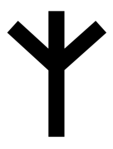 Tyr var också den manligaste av Gudarna, Bjarka-runan, som följer direkt efteråt användes som vi ska se ofta som en symbol för kvinnan, där Tyr alltid stod för mannen – man har än idag sett till och med toaskyltar på island, där Tyr-runan använts för ”män” och Bjarka för ”kvinnor”…Symboliken bakom det borde vara enkel att förstå – runan har en nedhängande stapel, och två små tvärstreck på sidorna – vilket kan symbolisera det manliga könsorganet. Bjarka däremot, står för de kvinnliga brösten, eller en gravid kvinna med bröst och mage sedda i profil.