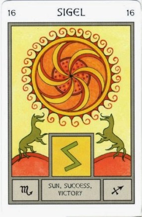 Brynhild, valkyrian som överbringar kunskap och inte bara är ett stridsväsen är själv en solkvinna, liksom Siv eller Sunna, solgudinnan själv – som förstås också har starka kopplingar till den femtonde runan. Också familjen, kärlek mellan människorna i betydelsen kärlek till nästan, eller vänskap, inte sexualitet, har kopplats till solrunan, som sägs representera lycka, framgång och härliga tider,och detta hör onekligen hit. Iöverförd bemärkelse står den förstås också för sommaren och våren, eller den ljusa årstiden överhuvudtaget.