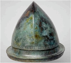 En av 26 hjälmar från 300 före vår tideräkning. Man påstår att runinskriten på den skulle gjorts år 100AD av en senare ägare, men det är osäkert om man gjort någon metallanalys (ärgad koppar kan avslöja hur gammal inskriften är, och om den är samtida med att bronshjälmen göts)