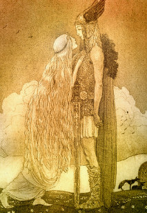 ”Maerum” är ett ord som i en annan grammattisk form förekommer även på Rökstenen, där det står ”Skati maeringa” alltså ”människors skatt”, mänsklighetens välgörare. De två människor Brynhild tänker på är väl i första hand henne själv och Sigurd, som ju sitter vid hennes sida på klippan; och läkehänder eller händer som kan uträtta något, är förstås gott att ha, de är lika solens skinande strålar, som lyser upp i tillvaron. Man och kvinna ska göra detta tillsammans, antyder Brynhild, och så ska de leva med varandra. Detta är visst ingen bön, som de kristna tänkt sig, för vi Asatroende ber aldrig, men en välsignelse, och en hälsning till Solen, vilket är något helt annat. Förstår man inte detta, förstår man inte heller Hedendomens innersta väsen. Och hon fortsätter: