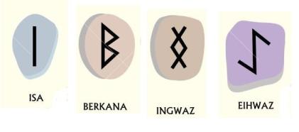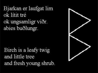 Inte konstigt då, att Bjarka runan sägs ha haft med kvinnor och fruktsamhet att göra ! Bjarka runan har dels kopplats till Frigg av Atreid Grimsson, dels Eir, läkegudinnan, och även fått symbolisera växtkraft i allmänhet enligt honom, något som dock går in på Eiw-eller idegransrunans traditionella betydelse. Runraden blir i så fall inte helt konsekvent, och själv tycker jag att det är bättre att betona, att Bjarka står för skapande av nytt liv, och moderskap i allmänhet. Inte heller varje runa kan kopplas till något trädslag, för Utmarken är inte något druidiskt beth-luis-nion alfabete, även om det finns en idegransruna, hagal jämförts med hagtorn, tyr runan med furan och bjarka som sagt med björken…