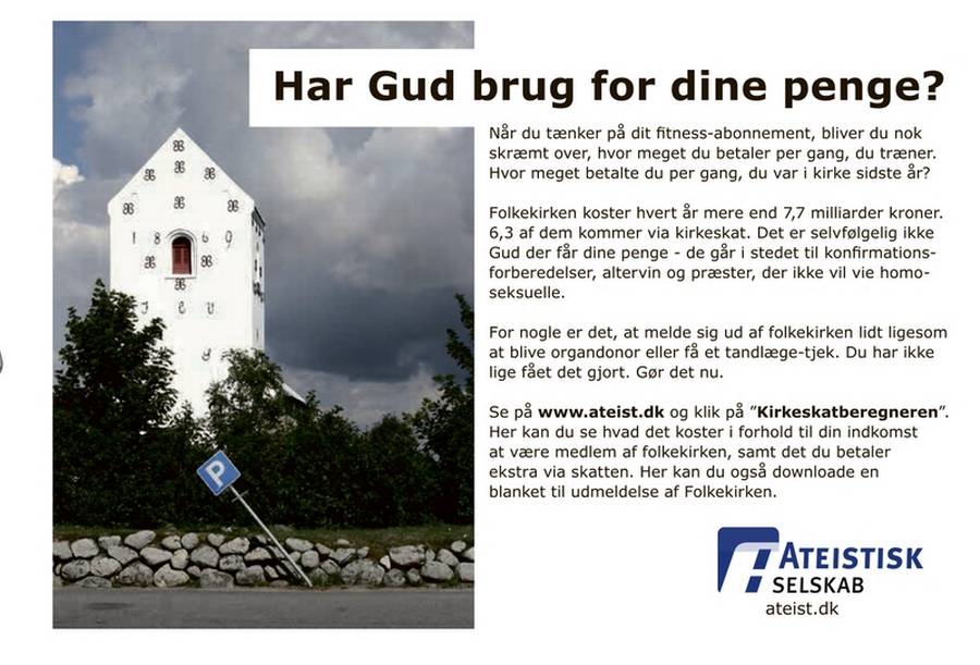 Den här mannen, Anders Stjernholm, Formand eller Ordförande i Ateistisk Selskab kommer till exakt samma slutsats som jag själv eller Humanisterna i Sverige till varför du bör GÅ UR alla Kristna samfund och Kyrkor, som försöker beskatta dig och din familj. Reklamkampanjer har startats, bland annat på bussar i Århus, och på en enkel nätsajt kan alla Danskar se hur mycket pengar ”Folkekirken” under en hel livstid stulit från varje dansk.