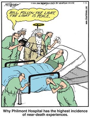 När amerikanska kristna – som ibland var läkare – på 1950-talet började med moderna undersökningar av de här fenomenen, gjordes det alltid i ett kristet kontext. Det hände till och med att man ”fejkade” nära döden upplevelser för patienterna, visserligen inte med så enkla och primitiva metoder som på skämtteckningen här ovan, men i alla fall. Många sjukhus och läkare blev senare avslöjade och påkomna med att ha använt minst sagt dubiösa forskningsmetoder, eller att vara alldeles för okritiska emot vad ”återupplivade” kristna patienter berättat.