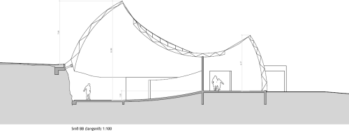 En enorm sal (jämför människofiguren) i en böjd, skeppsliknande takkonstruktion är till hälften nedsänkt i marken – detta är en byggnadstyp, som aldrig skådats tidigare…