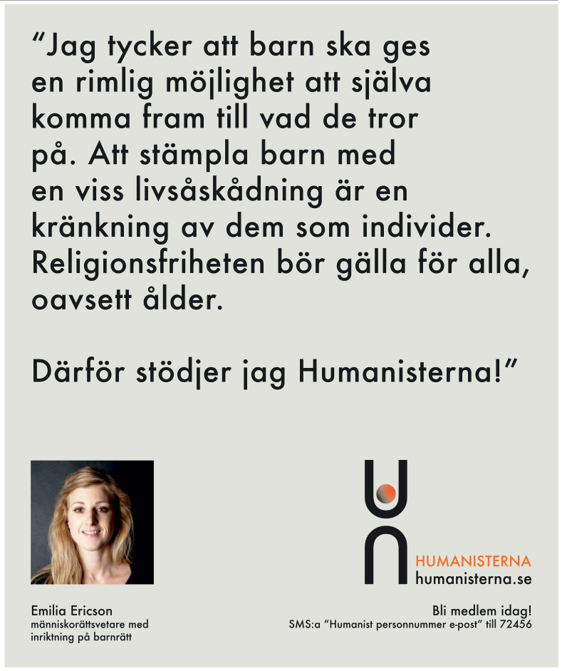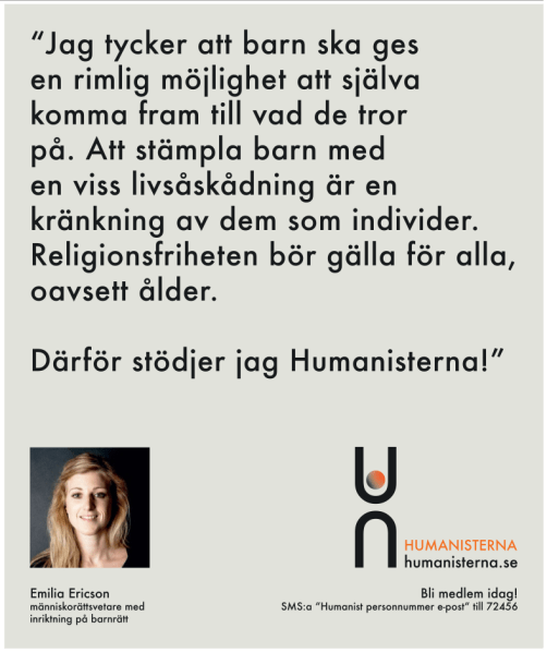 Själv drömmer jag om den dag, då inget litet barn i Sverige längre drabbas av de kristnas terror, utan får välja sin livsfilosofi och livsåskådning alldeles själv – när det kommit upp i mogen ålder, och alls kan genomföra ett aktivt val..