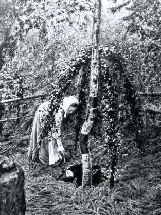 Nästföljande kväll återkom ungdomarna och arbetade vidare under tystnad. Nu skulle det göras fint på marken runt källan. Masarna lag dit färskt, friskt doftande granris med början närmast källan och sedan utåt. Kullorna plockade blommor för att göra en vacker krans.