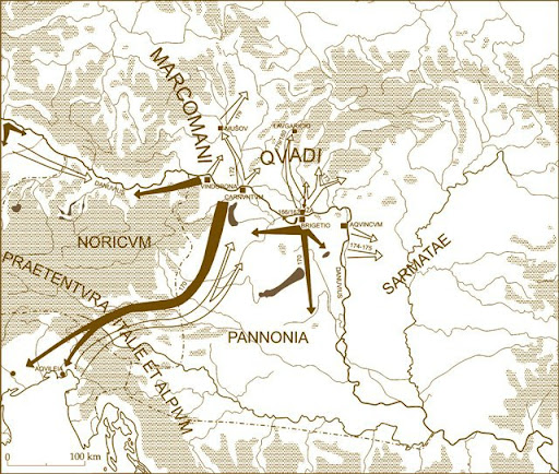 Vida viktigare och mer intressant var att just Semnoner och Sueber på 100-talet bildat ett stamförbund riktat mot Romarna – och att de med full kraft utkämpade inte mindre än tre stora ”Markomannerkrig” emot dem, i hela 14 år, från 166 – 180 AD. Krigen får betraktas som en taktisk seger, och de var nära – mycket nära – att klyva hela riket på mitten, när de slog till mot Noricum – dagens Österrike – och Pannonien – dagens Ungern – dessutom med hjälp av Sarmaterna och andra Germanska lydfolk, som jag skrev om så sent som igår…