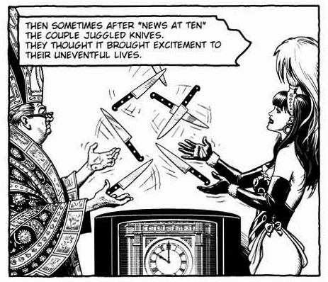I det första avsnittet framstår ”Aktrisen” som ungefär 40 år, något gnatig,åldrad i förtid, en skugga av sitt forna jag och vad hon en gång k-a-n eller kunde ha varit, men i alla senare episoder är det helt annorlunda. Brian Bolland själv har flera gånger förklarat, att det sista han egentligen ville, vara att göra något pornografiskt av sina två rollfigurer, eller att vi ska uppfatta dem på just det viset. Deras förhållande som makar eller vad de nu är (vi vet fortfarande inte riktigt, som läsare) är helt uppenbart inte av det sexuella slaget. Han ville – har han sagt i intervjuer – göra Aktrisen – hans fru – till viljes, och därför skildrar han henne hela tiden som ett stycke yngre, och bra mycket vackrare än hon i själva verket borde vara – eftersom hon också uppfattar sig som sådan… Som Brittisk Gentleman och samtidigt Biskop är det egentligen hans skyldighet, förstår ni – samtidigt som hela serien försiggår på rim, inte på prosa, varje pratbubbla är egentligen en hel liten rimmad dikt, med ”inrim” i fyrdubbla rader och allt – helt enkelt därför att det passade honom att göra så.