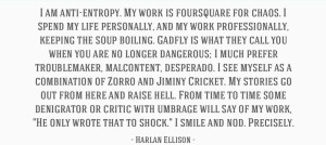 Precis som arbetarförfattaren Sven Wernström i Sverige (som han absolut inte kände till) med sin bok ”skrivandets hantverk” hävdade Harlan alltid, att skrivande är ett hantverk, inget annat. (”I’m a craftsperson and I work at my craft – that’s all I can do” – det sa han själv – till mig också !) Han gjorde mycket för att de-mystifiera författaryrket och sig själv, men blev ironiskt nog föremål för desdå fler falska rykten och myter. Författare är inga gudalika vitskäggiga gamla profeter som skriver i elfenbenstorn, eller på höga bergstoppar bortom molnen, utan de är alla medlemmar i en yrkeskår, som inte är ett djävla dugg bättre än horans, eller för den delen snickarens, och rörmockarens.. ”Och ingen Gud ska komma ner från bergen och rädda era svarta själar och liljevita arslen – det ska ni inte tro !” (det är ett citat av honom själv, från ett förord betitlat ”the waves in rio” översatt av mig själv)