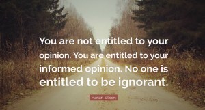 Nej, ALLA har INTE ALLS ”rätt till en åsikt” i kraft av YTTRANDEFRIHET eller något sådant. Man måste skilja på åsikter och fakta. Man har ALDRIG rätt att yttra sig, om man tror på det som är FELAKTIGT eller FEL I SAK. 1957 – 1959 gav sig Harlan Ellison in i USA.s Armé, där han tillhörde pansartrupperna i Georgia. I stridsvagnar och stridsfordon av alla slag har man nytta av kortväxta och små personer, och tjänsten där passade hans temperament. ”Fort och Fel” brukar man säga är pansartruppernas valspråk i Konungariket Sveriges Armé, som jag väl känner till efter mer än tjugo års samlad tjänstgöring. I själva verket är det ”Eld och Rörelse” – den moderna stridens två grundelement, giltiga i alla tider – som är deras valspråk. Han utgav några artiklar för garnisonstidskriften ”Inside the Turret” men annars gjorde han knappast någon karriär, blev aldrig mer än private eller menig, och inte ens 1st Sgt eller plutonchef, som vissa andra snillen någonstans, var det nu kan vara… Episoden med Armén var något Harlan Ellison aldrig skrev om, aldrig talade om, aldrig beskrev – men så var han nog också lojal emot sitt land, trots ibland mycket vildsint liberala åsikter på 60-70 talen. Han gisslade Nixon och Reagan mycket hårt, men vad han tyckte om Donald Trump har aldrig förmälts mig. Antagligen tyckte väl Harlan Ellison att Trump var under hans värdighet som författare och människa att alls kommentera, och det är förmodligen lika bra.
