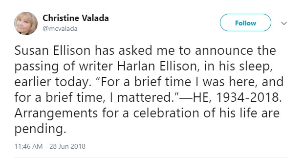 Det första twitter-budskapet om Harlan Ellisons död, från morgonen 28 Juli i år. Han hittades död i sin säng, i sviterna efter en stroke, som han ådrog sig redan hösten 2014. Han ville INTE ha någon begravning alls, men en stor och hjärtlig hyllnings-fest för själva livet… Hans många vänner skrek, bönade och bad honom om att han skulle ”välja sina strider” som det så vackert heter, men det ville han egentligen inte. Men så en dag kom han på något – och det var med frågan ”Where does a writer go to get his ideas?” från en okänd beundrarinna, vilket han själv blixtsnabbt besvarade med ortnamnet ”Schenectaty !”. (Den orten är en liten tråkig förstad till New York, fylld av smutsiga industrier – ungefär som ett amerikanskt ”Älvsjö” – men Harlan tänkte sig alltså att där skulle sitta en liten, liten man på en firma någonstans, occh för en usel lön dela ut bruna kuvert med idéer i) Han insåg nämligen, att han ju kunde sälja själva idéerna och uppslagen till de stora filmbolagen i Hollywood, och sedan låta någon annan skriva alla manus, som en ”creative consultant” under pseudonym ungefär, och sen kamma hem hela vinsten. På så sätt blev han mycket framgångsrik, och lyckades redan under 1980-talets första år komma upp i inkomster på 475 000 USD eller mer, vilket var mycket pengar just då.