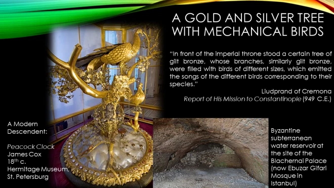 Kejsaren av Bysans hade en tron, invid vilken mekaniska lejon röt med röster av metall, och så hade det varit ända sedan Justinianus dagar på 500-talet. Frankiska ambassadörer från det kristna Europa, som Liutprand och många andra, var långt fattigare än Väringarna, sämre klädda och luktade illa.. Hon hade tidigare fått bevittna hur en av Väringarna själv satte sig på den Byzantiske Pantokratorns eller Världshärskarens tron, och vägrade gå därifrån, trots att man enträget bad honom om det..