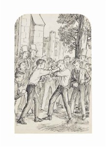 Det där hände på 1960-talet, när han var mycket ung. Framför ett Bok-Café, ja Bok-Caféet ”Röda Rummet” i Uppsala faktiskt – och det var bara en ungdoms-synd – nåja, han var i trettioårsåldern och inte så ung, i alla fall nästan, och utgick från sunt biologiska teorier av vetenskaplig natur, såsom att det faktiskt är en inbyggd naturlig tendens för alla sorters han-djur att försvara sina hon-djur ifall trängande hot eller fara uppstår. Också vi människor fungerar egentligen likadant, vi slåss exempelvis inte emot kvinnor eller barn, inte ens någon helt likgiltig kvinna vi en gång mött, eller kanhända barnet inom oss själva.