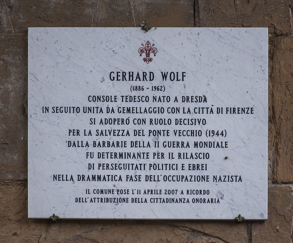 Den man vi påstås tacka för det lär vara en viss Gerhard Wolf, tysk konsul i stan och sedan 2007 också hedersmedborgare, vars minnestavla finns mitt på bron, nära Benvenuto Cellinis självporträtt. Men de verkliga hjältarna i denna historia har aldrig fått något monument…