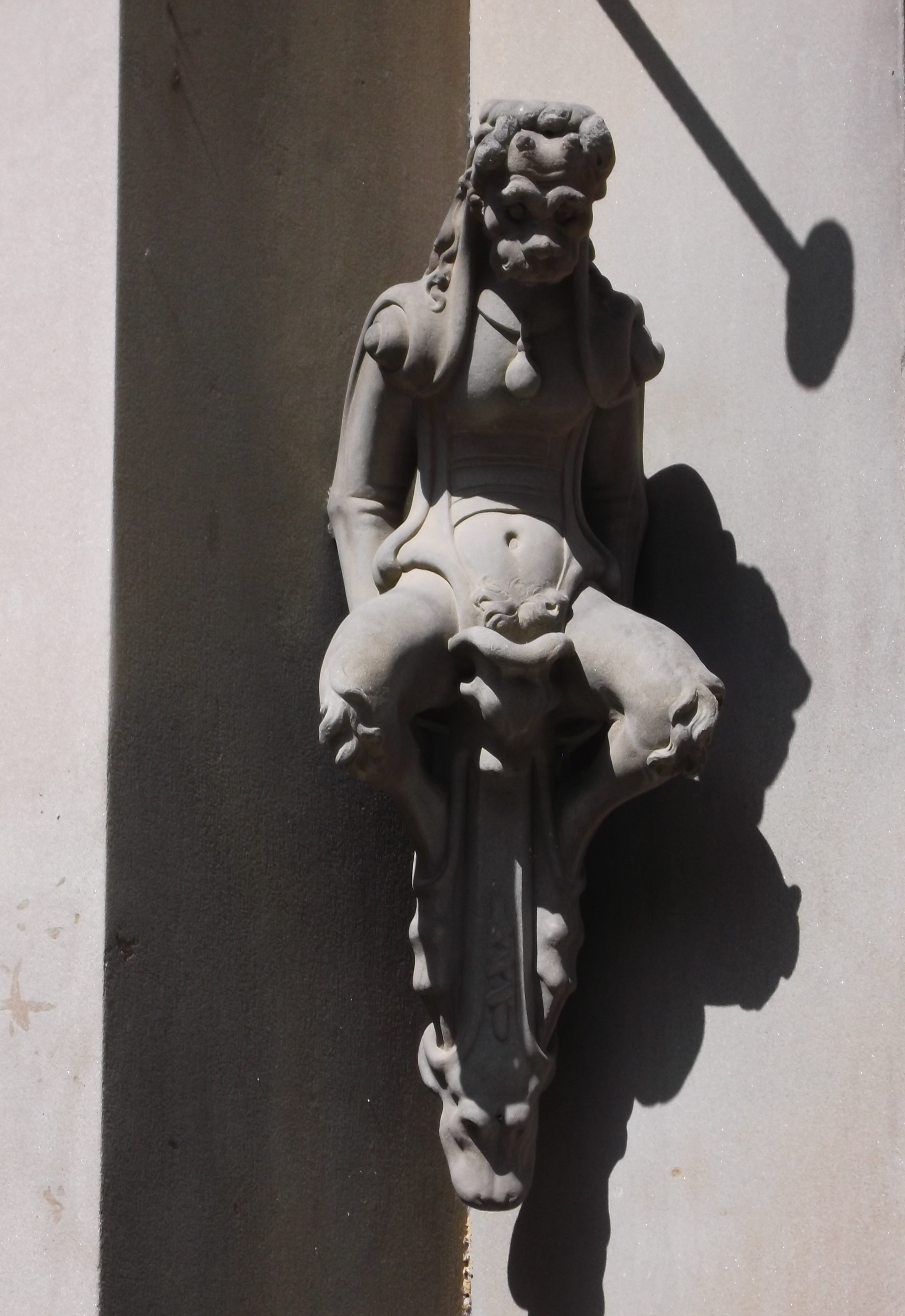 Som ”hängränna” eller vattenkastare valde han dock den här groteska figuren med hundhuvud och allt, som visar upp sina genitalier och skiter ut spillvatten. Skall det vara en ”fornsedare” måntro ? Eller bara en helt vanlig italiensk skitstövel ?