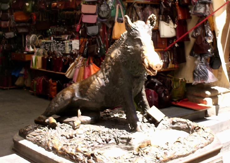 Jag har också sett honom som kopia i brons, till salu i staden Florens exklusiva antikaffärer och i enkla marknadsstånd. Frej har gett honom makten, och näst Machiavellis grav vet jag ingen annan sevärdhet i Florens, som lockat mig så mycket. Sist jag besökte honom var 2008, då den nya bronskopian av honom installerades nere vid Mercate Nuovo, där han alltjämt står, men sedan dess har hans tryne blivit utnött och företeer synliga skador, där folket alltför mycket pussat och kysst honom.