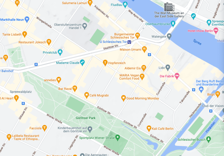 Vid Spree infinner sig den kända Oberbaumbrücke, det gamla Heeresbäckerei, som är mässlokal numera, och på andra sidan floden finns det trendiga Friedrichshein, som innehåller en ändlös rad av svartklubbar, klädaffärer för Hedningens väninnor (Dem ska ni hålla tassarna borta ifrån ! – Finger weg und Schluss damit !!) och mycket annat, som ni egentligen inte behöver känna till och nog inte vill veta, även om Hedningen för sin del redan gör det. East Side Gallery och de numera föga sevärda sista resterna av den gamla Berlinmuren behöver ni däremot inte besöka, omgivna som de är av nya gentrifierade bostadshus i neobrutalistisk stil. Så småningom – eller om bara trettio år – kommer de att vara lika rivningsfärdiga som det mesta av 1960-talets ”Plattenbaus” och därmed är de helt ointressanta i alla fall.