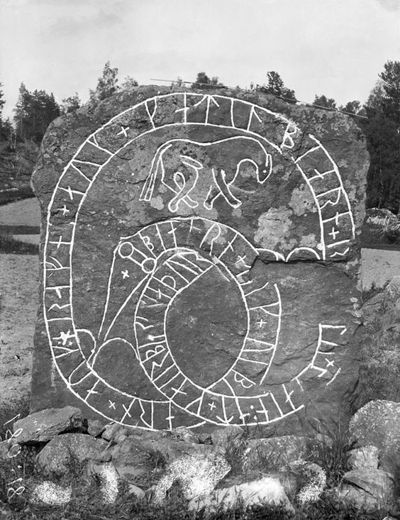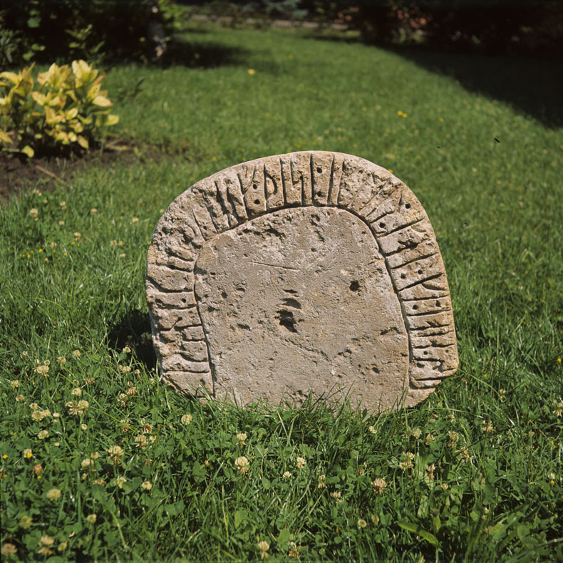 Den hedniska runstenen – UTAN kors – som ännu står kvar på Berezan i kopia – vars text lyder: ”Grane gjorde detta valv över Karl, sin Fä-lagi” (en frände, som man samäger en båt med)