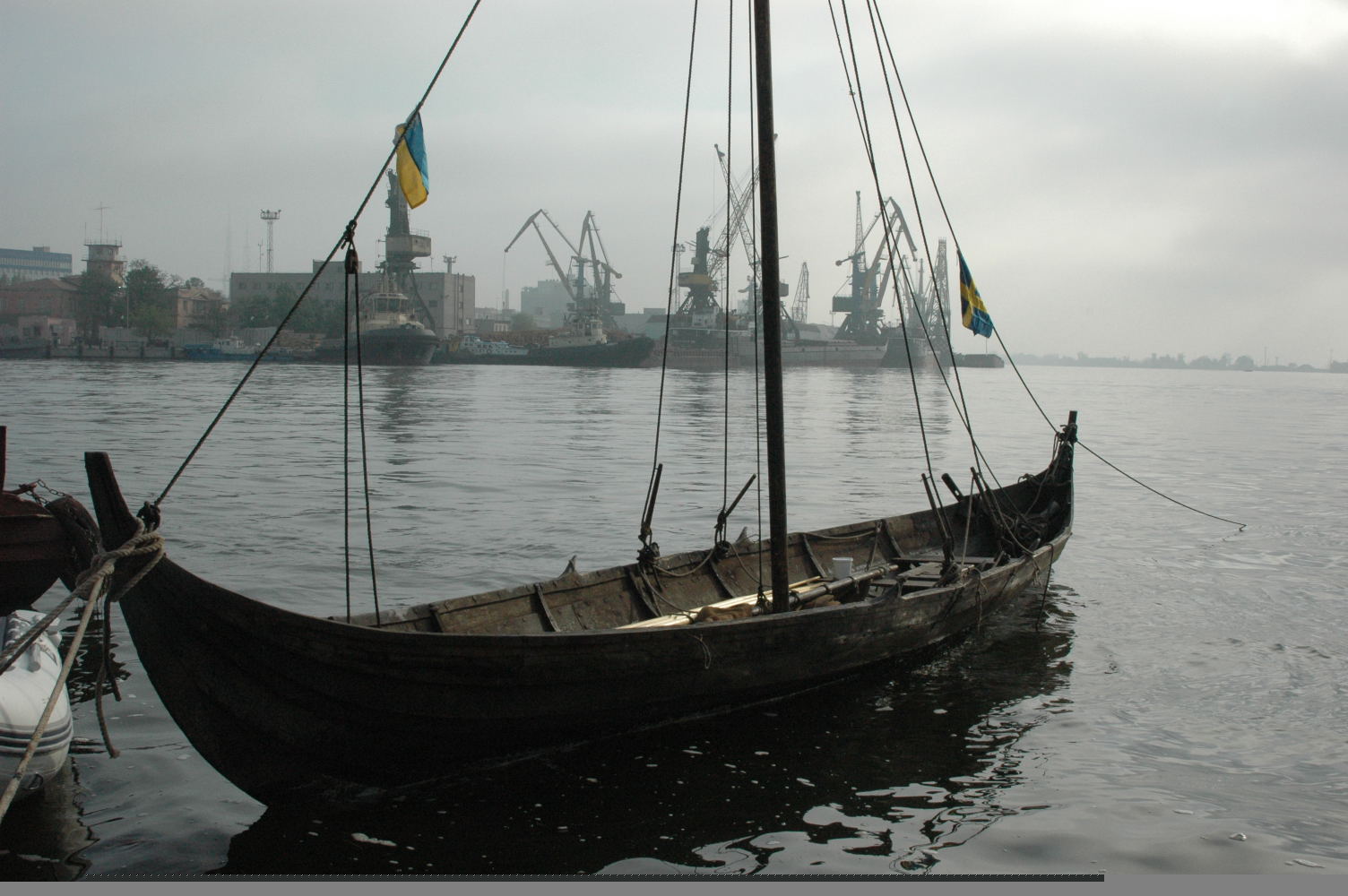 Där kom nu en procession, bestående av stadens port commissioner eller Högste Hamnkapten, Ukrainare i armé, flottist och marininfanteriuniformer, och mitt i alltihop en liten man i hatt med portfölj, som jag trodde skulle överlämna en officiell protestnot, och en order om att genast lämna hamnen. Men det visade sig, att stadens främsta bara bokat den där bastun, på samma tid som vår. Nu bar det sig inte bättre, än att jag och vår tolk nakna – så när som på varsin handduk – fick förklara vad vårt skepp var, och varför vi utan motor och med bara segel och åror seglat nedför Dnejpr från Gammalsvenskby eller Smievka, och att vi alla var hedna män. När vi sagt detta, lade den störste och kraftigaste ryssen fram en Nagan automatpistol i ”ugglemodell” på bordet i bastuns eller ”Bannikens” omklädningsrum, och medan de andra efter rysk sed hällde öl på bastuns heta stenar och skrålade därinne gick jag ut för att svalka mig i Dnjepr. Dnjepr eller Borysthenes är som alla vet en kall flod, nära 10 grader kallare än det sommartid så varma land den genomflyter. Så dök jag ned i floden, och ställde mig på dess botten; och höll andan där. Då kände jag en ännu kallare hand på min skuldra, och såg skymten av en man, som började brottas med mig. Värre tag har jag sällan genomlevat, men jag vann ändå, för luften tröt för honom nästan samtidigt med att den tröt och tog slut för mig med, och så länge han höll mig nere, kunde jag också hålla nere honom, och hindra honom från att komma upp igen. Så steg vi båda mot ytan, långt däruppe och då först såg jag, att det var den flintskallige, vars vapen vi nog inte skulle röra. Han hade lagt fram det där, till allmän beskådan, liksom bara för att testa oss. Senare fick jag veta, att han var överste i Marininfanteriet; av vilket Ukrainarna bara har kvar ett enda regemente idag. Och kanske jag borde gått i den mannens sold och gett mig under hans fana, för Ukraina var på den tiden ett vänligt och fredligt land, där värden och värderingar är en smula annorlunda; än hos oss; och man ej lägger vikt vid småsaker, precis som det en gång var på Olaf Tryggvasons tid. Där fanns i alla fall friheter i smått och stort, som vi inte har idag.