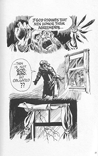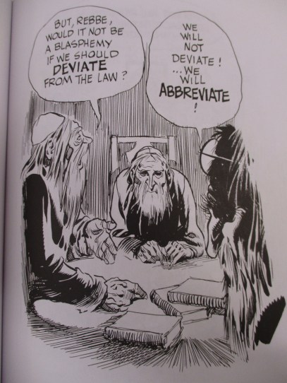 Det vimlar av enkelspåriga Monoteister, som inte förstår att måttlös materialism, ateism eller hedonism skulle vara det enda alternativet till just deras religion, men Eisner lät sin huvudperson njuta av livet, så väl det nu gick. Han stal för det första alla pengarna ur den synagogekassa, vars förvaltare han var; men bara för att köpa hela det hyreshus vari han bodde, och göra en god gärning för grannarna där. Så skaffade han sig en kristen älskarinna, och hade kul tills pengarna försvann, men på sin ålderdom ångrar sig förstås Frimme, Eisners fiktiva jag. Då går han till ett gäng svårartat konservativa rabbiner – samma gäng, herrklubb eller ”Högsta råd” som Aron Verständig tydligen ständigt förestår här i det verkliga Svedala. Han ber dem göra upp ett nytt kontrakt åt honom, men de svarar såklart att det inte går, eftersom det vore HÄDELSE, och att kontraktet bara kan återskapas i en svårt stympad och förkortad form – en gång förlorat, kan människans kontrakt med ”gud” aldrig någonsin återfås, och det är kanske lika gott det.