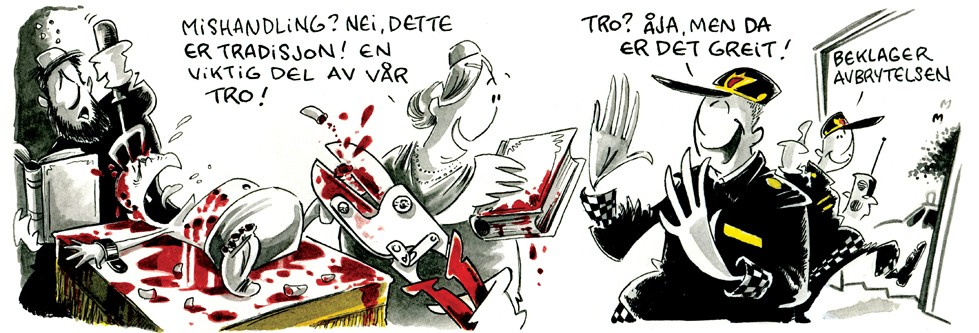 Norsk skämtteckning ur ”Aftenposten” – och vad handlar religiös tro om, hursomhelst ? Att stympa människor, eller märka dem för livet… ? Skulle inte tro det…