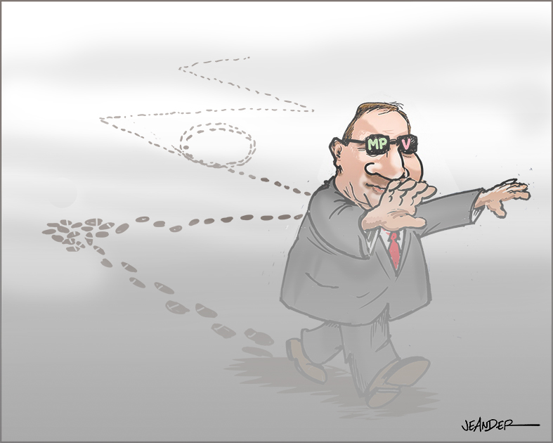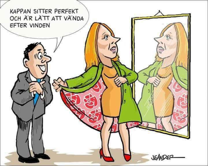 Hon lägger sig till med en kappa, vid och trind – för ska man LYCKAS, får man VÄNDA KAPPAN EFTER VIND – Ena dagen vill hon äta sina skor… Andra dagen vet hon inte vad hon tror… Byter åsikt lite hipp som sådär – Kan ni gissa vem hon är ? För sitt eget parti har hon blivit HELT DÖV… Säg luktar här inte RUTTNA LÖÖF ?? (teckning av J E Ander, svensk karikatyrtecknare)