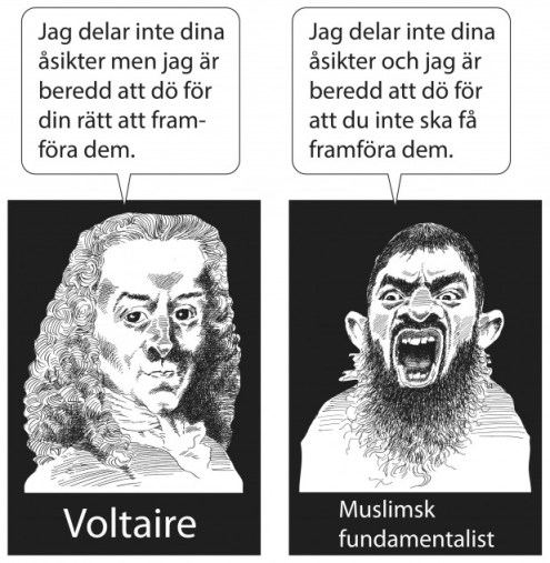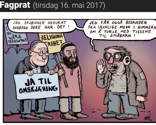 ”Visst serru jude-prällen och imam-grabben ! Gud sa åt mig i en dröm att jag skulle få tafsa på pellevinken på småkillar – så jag förstår vilka problem ni har !” (teckning ur norsk fackpress)
