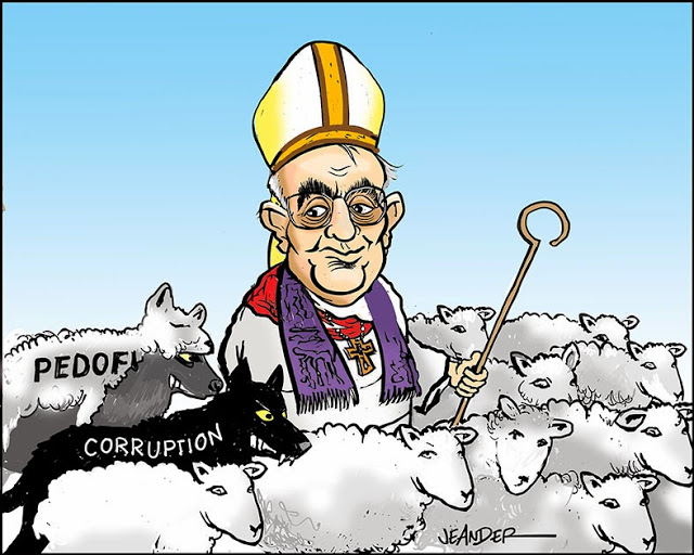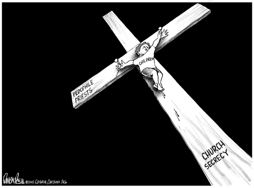 Vi har sett hur detta mönster upprepat sig om och om och om igen, överallt, i alla de länder där denna variant av kristendomen tillåts vara verksam. Kardinal Peel och hans övergrepp i Australien. Barnhemmen på Irland, där fynd av spädbarnslik gjorts i septik-tankar. Rapporter om systematiska övergrepp, sedan 1950-talet och genom hela efterkrigstiden från USA, Island, Brasilien och många andra länder. Hans Helighet Påvens erkännande av att så många som 2 % av Katolska kyrkans präster och religiösa funktionärer kan vara pedofila, vilket tillsammans – på grund av denna kyrkas storlek, rent numeriskt – blir drygt en miljon kristna förövare, som fortfarande får springa omkring lösa i jordens alla länder, i varje samhälle, i varje stat… Ja – jag har skrivit många många gånger förut om alla dessa problem, som Monoteismen och Påvens vägran att upplösa Celibatet utlöser, liksom hela denna kristna kyrkas problem i sig.