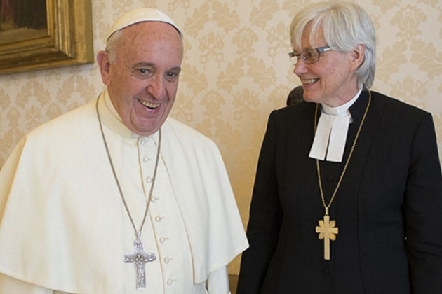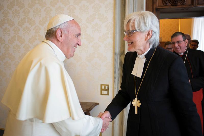 Tyvärr har vi nu en förvirrad gammal dam kallad ”Antje Jackélen” i lustig hatt som överhuvud och ”främste företrädare” för ”Svenska” Kyrkan, vilken nu hela tiden säger, att vi måste ”samarbeta” med Katolikerna. Hon påstod inför 500-års jubiléet av Martin Luthers teser år 1517, att vi måste ”bjuda in” Påven till Sverige, att det måste hållas ”katolska Ungdoms-galor” på Malmö Stadium, och annat sådant. Vad ligger bakom ? Varför försöker vissa krafter i vårt samhälle hela tiden ”återlansera” Katolicismen i vårt samhälle, och vad har vi svenskar – och alla andra – egentligen att vinna på det ?
