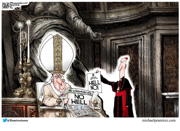 Kanhända är det här början på en ny schism inom Katolska kyrkan, som får ännu fler människor att lämna den inom kort. Det hedrar ju påven att han numera insett han inte företräder någon god eller logisk religion – att döma folk till evig plåga i ett katolskt helvete låter ju verkligen inte människovänligt eller bra – och onekligen måste kristendomen anpassa sig till dagens värld, om den alls ska ha någon plats här överhuvudtaget… Vi får väl se hur det hela utvecklar sig..