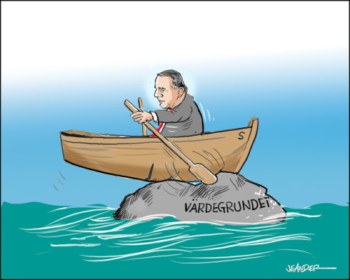 Det torde vara fullständigt UPPENBART att Regeringen Löfvén GÅTT PÅ VÄRDEGRUND (teckning av J E Ander, svensk karikatyrtecknare)