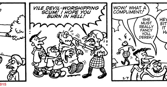 Serierutor ur den brittiske serietecknaren Lew Stringers ”Suburban Satanists” eller ”Förorts-Satanisterna”. Tror någon verkligen att man kan bekämpa det lokala ”buset” med vapenförbud och uppmärksamhet ? Är det effektivt i längden, eller den åtgärd som behövs ??