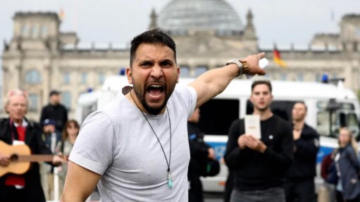 Attilla Hildmann har också gjort sig känd för att attackera kamera-team vid sina tidigare ”aktioner” men han behöver inte nödvändigtvis kopplas till de senaste fallen av vandalism i Berlin… (foto: Berliner Zeitung, 28 Juni 2020)