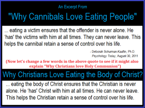 När man under 1900-talet och i vår egen tid intervjuat riktigt sjuka psykopater och kända lustmördare som Peter Kürten, Geoffrey Dahmer och andra sådana, så har de alltid sagt samma sak som de kristna: Kannibalismen har gett dem en särskild ”kick” och de har blivit religiöst upphetsade av att dricka blod från sina offer, äta kroppsdelar från dem osv – ofta anger de den kristna ”Nattvarden” som direkt inspirationskälla, och tycker att deras egna illdåd är som en ”religion” för dem, vilket ju inte ursäktar vad de gjort – och fortfarande gör..