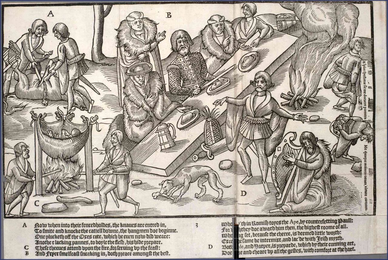 Fyrtioåtta ollonsvin, väl gödda, var vad kung Harald brukade låta slakta till jul; och han brukade säga, att om detta också inte räckte till för hela julen, blev det dock alltid en god smakbit åt envar, och därefter finge man nöjas med får och oxar. Köksfolket kom två och två, i en lång rad, med stora rykande kittlar mellan sig; andra buro tråg med blodkorv. Köksdrängar med långa gaffelspett följde med; och sedan kittlarna ställts ned bredvid borden, stucko de spetten i spadet och fiskade upp stora bitar, som lades för gästerna i tur och ordning, så att ingen mannamån kunde ske; och åt envar lades en god aln blodkorv, eller mera om någon så ville. Brödkakor och stekta rovor lågo i lerfat på borden; och vid bordsändarna stodo kar med öl, så att horn och kannor alltid kunde hållas fyllda.