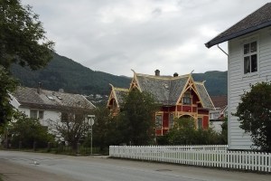 På andra sidan riksvägen förbi gamla Nordfjoreids centrum ligger Skjoratippen, en oval, skeppsformad gravhög, först undersökt 1902-03 av arkeologen Hakon Shetelig. Den var ursprungligen 32 meter lång och hade en höjd på 3,2 meter – och är kanske lite högre i nutid, då den kröns av det stenmoument från tidigt 1900-tal somstår där idag. Tyvärr fick vi aldrig tillfälle att gå upp på den, men kom ändå hem med de foton vi ser här. Sjoratippen borde betraktas som helig mark – då den varit begravningsplats för högättade personer under minst 200 år av Hednisk tid som ett ”gravskepp” och det fanns också en tredje båtgrav från en hög med en diameter på 27 meter – 50 meter öst om Skjoratippen, där det idag ligger bostadshus, som ni ser på bilden ovan. Man förstörde det mesta som fanns på platsen under det kristna 1900-talet, och under den bostadsplatå, som innehåller lador och uthus från den nutida gården Myklebust, har man heller aldrig grävt på allvar. Sådana är förutsättningarna för arkeologin i det trånga och ibland väldigt trångsynta Norges smala dalar.