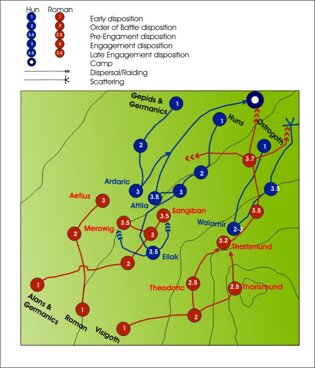 Hur slaget vid Chalons 20 Juni 451 gick till – Observera at Östgoter och Gepider var minst hälften av Atillas stora här.