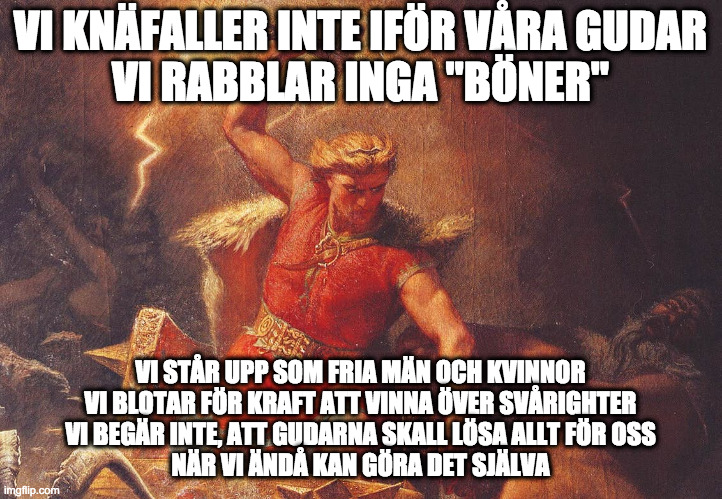 Ja – de har alltid gjorts till Syndabockar, dessa Hälsingar – för sin tro, sitt liv och alla deras gärningar – liksom så många av oss etniska svenskar som fortfarande är Asatroende. Men vårt verk består, överallt där hederliga män och kvinnor arbetar, smider och bidar sin tid. Både Hälsinglands Tidning och ”Ljusnan” har uppmärksammat vad som skett, och så segrade inte de kristna hatarna – den är gången heller.
